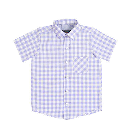 Boys' Checkered Shirt – White & Light Purple, Short Sleeve, Button-Up, 100% Cotton