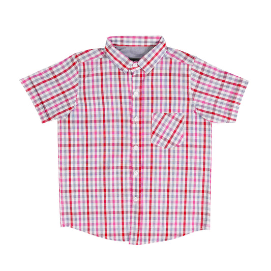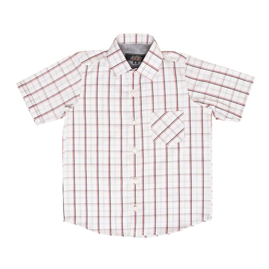 Boys' Checkered Casual Shirt – White, Red & Black Plaid, Short Sleeve, 100% Cotton
