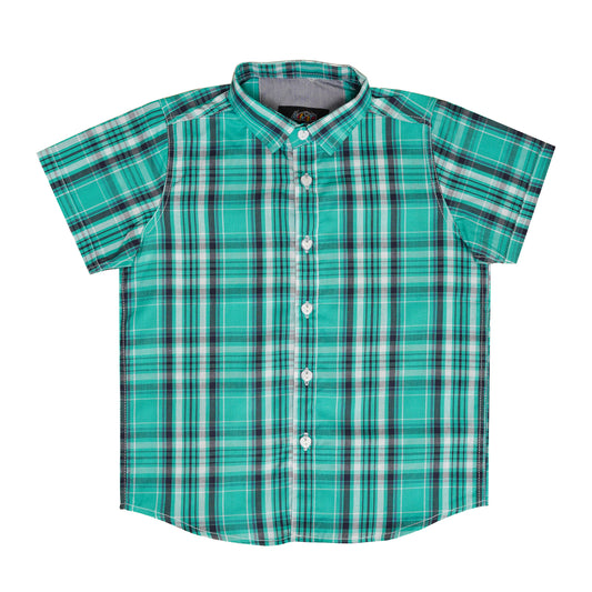 Boys' Checkered Casual Shirt – Bluish Green & White, 100% Cotton, Short Sleeve